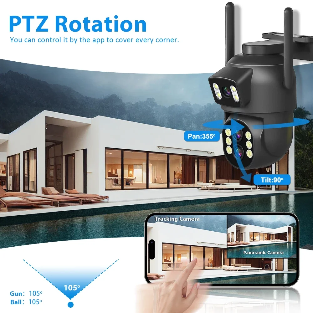 *The camera has two lenses, the upper lens is fixed, and the lower lens can rotate, perfectly achieving one camera to monitor two directions. In the APP, dual screen display of monitoring images .