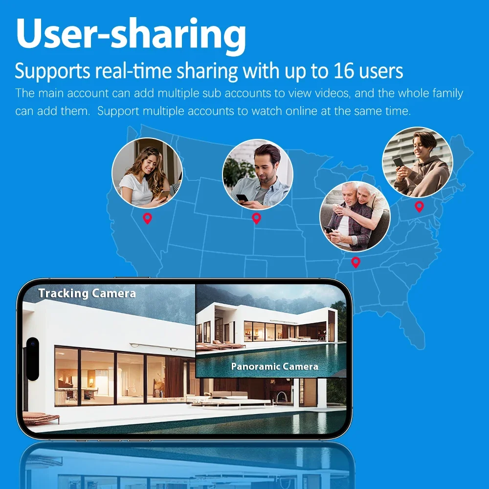 Surveillance cameras support sharing to 16 users, 16 users can simultaneously watch the surveillance screen and operate the basic functions, multi-member families are no longer afraid to share the number of users limitations