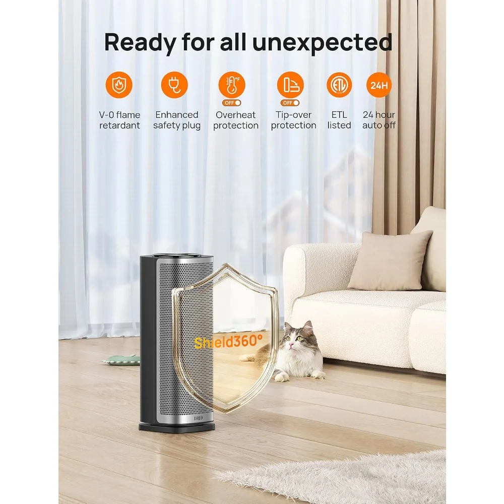 - Unmatched Safety and Protection: Our Shield360° system ensures ultimate safety with tip-over and overheat protection, along with a 24-hour auto-off feature. Made with V-0 flame-retardant materials and a bend-proof safety plug, this ETL-listed space heater guarantees peace of mind at home.